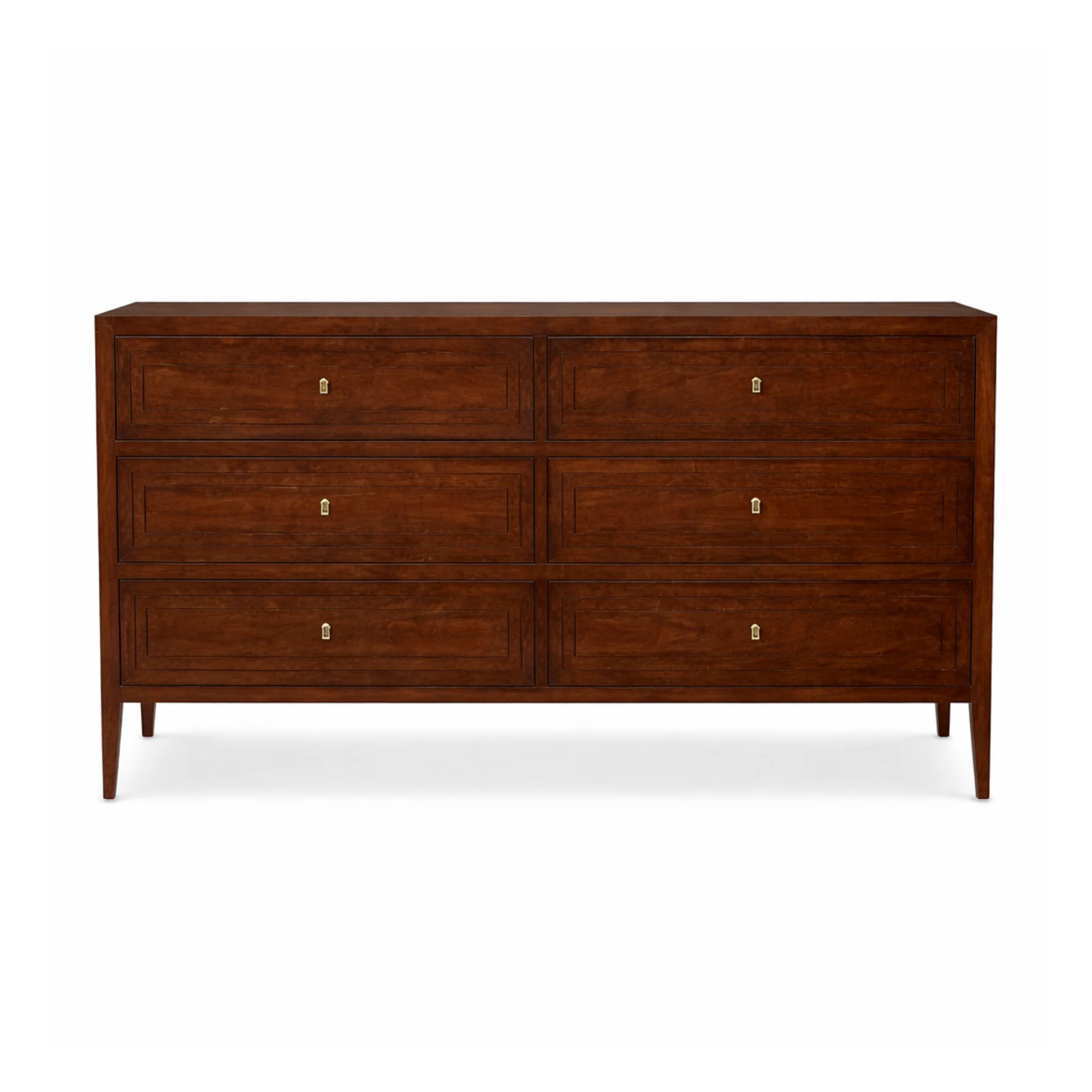 The Fremont dresser offers clean lines, brass hardware, and a refined finish that reflects an understated sophistication. This dresser provides generous storage in a streamlined form, making it a versatile anchor for the bedroom.