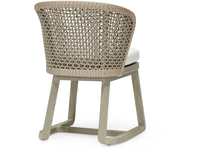 Teak wood frame and legs in a weathered grey finish with a double wall back of woven marine grade synthetic rope in a taupe and grey finish with maximum UV protection. Chair comes with a loose seat cushion.